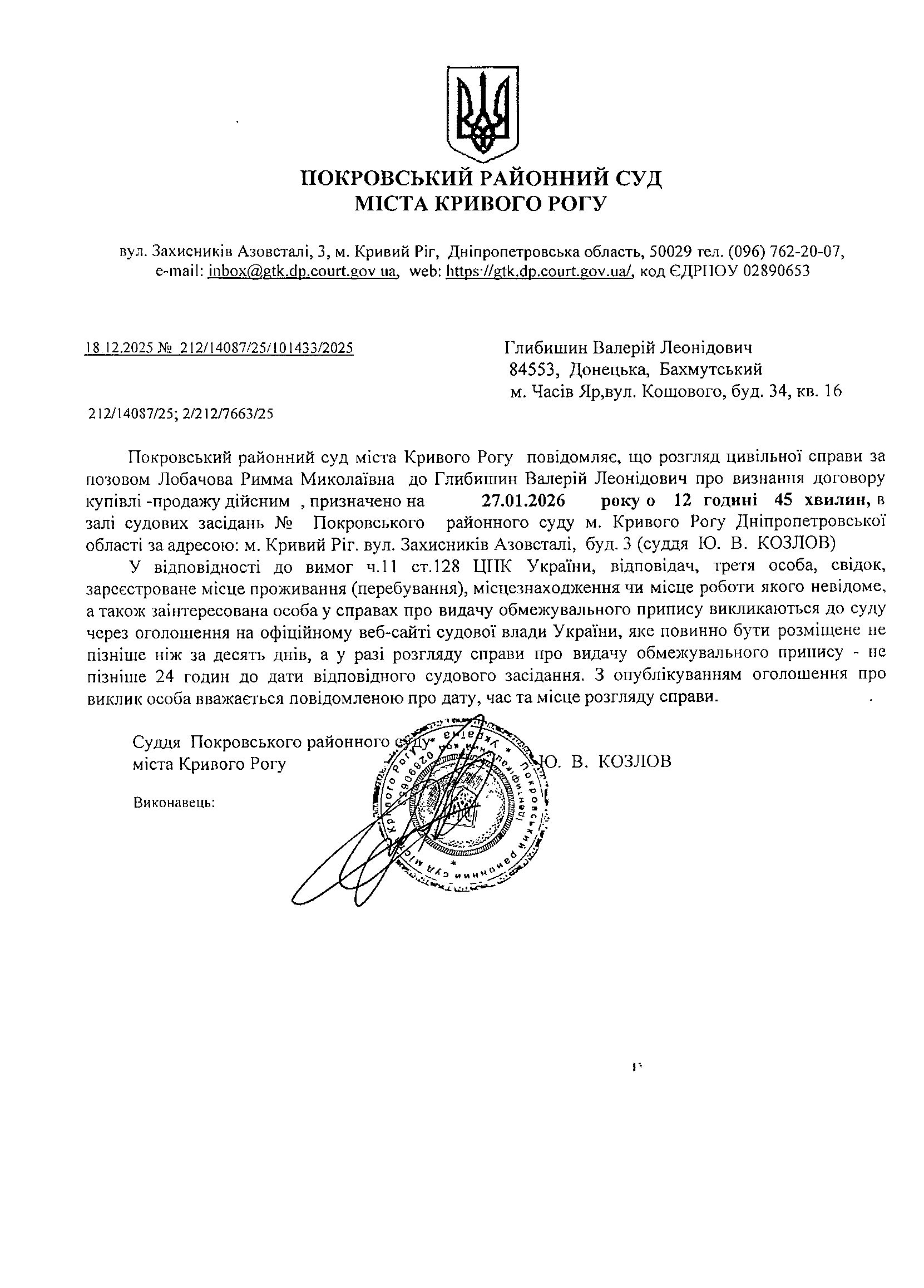 Оголошення про виклик до суду Глибишина Валерія Леонідовича