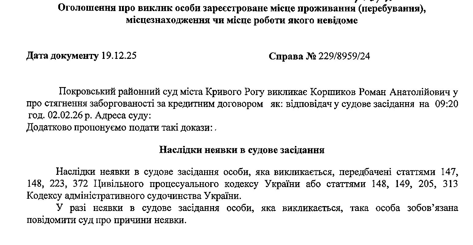 Оголошення про виклик до суду Коршикова Романа Анатолійовича