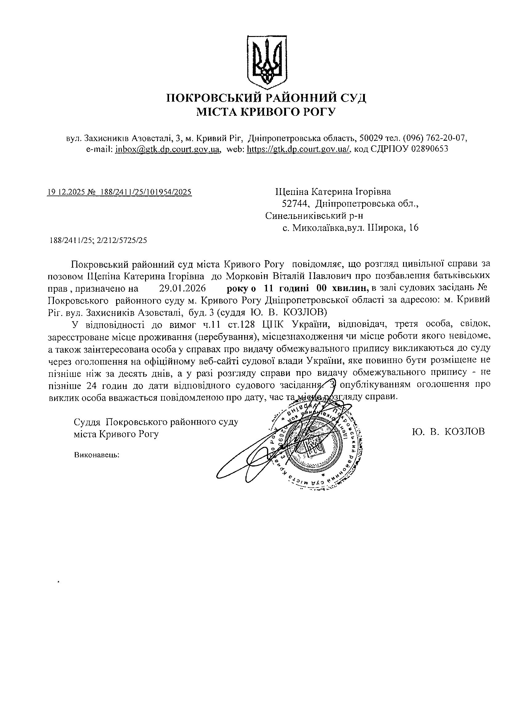 Оголошення про виклик до суду Щепіної Катерини Ігорівни