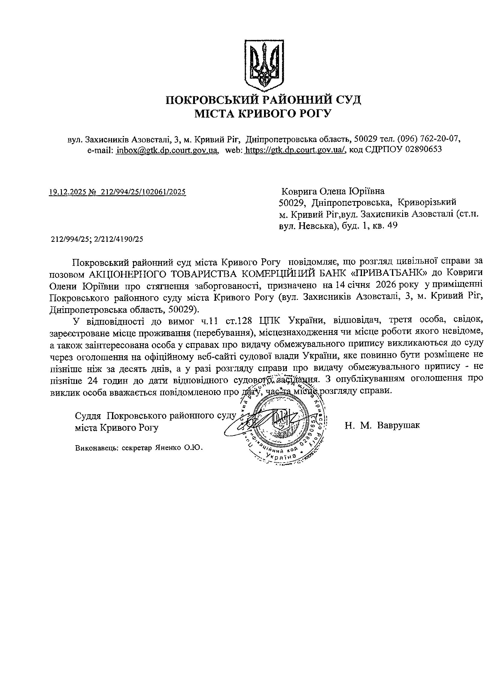 Оголошення про виклик до суду Коариги Олени Юріївни