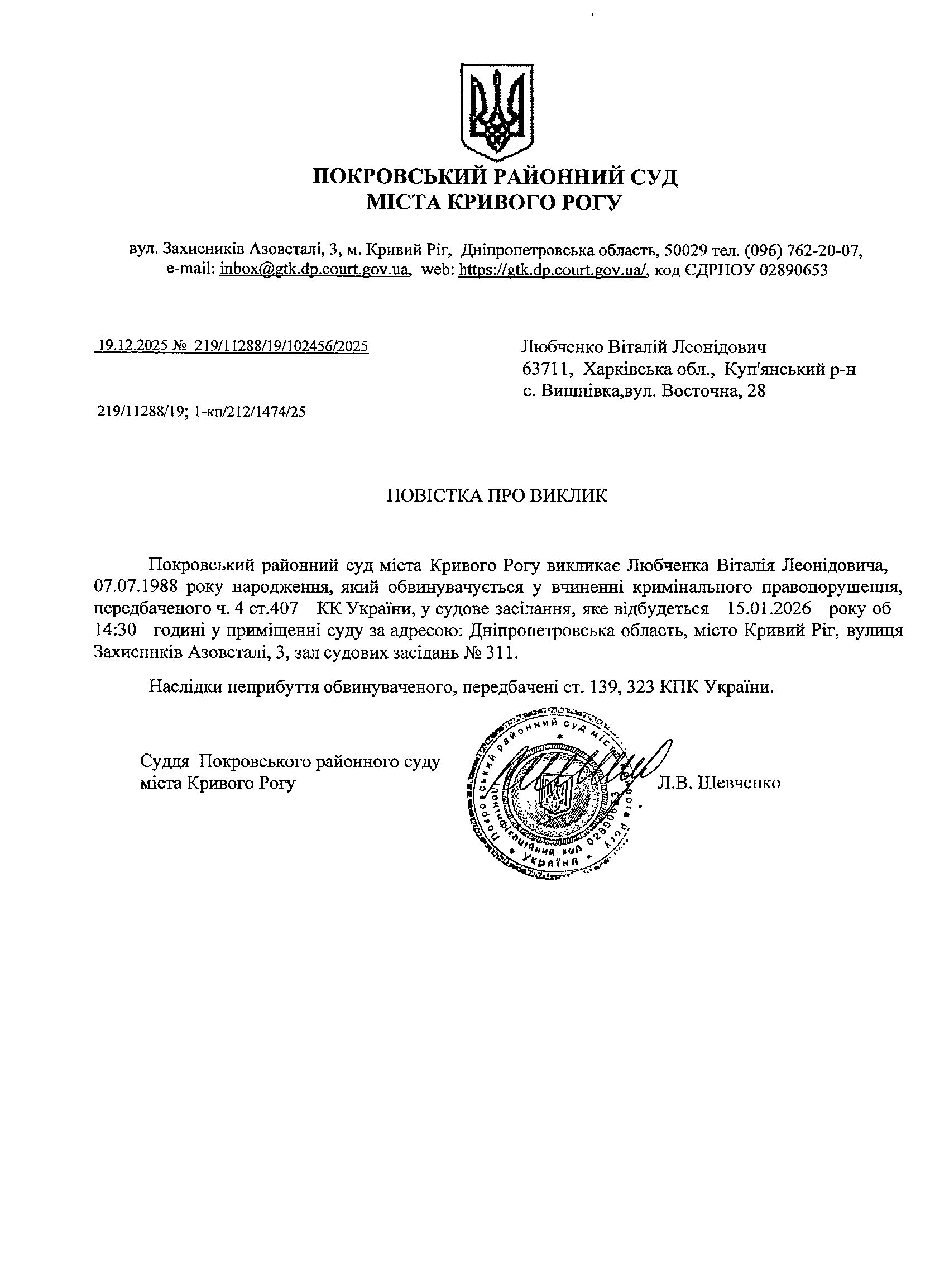 Оголошення про виклик до суду Любченка Віталія Леонідовича