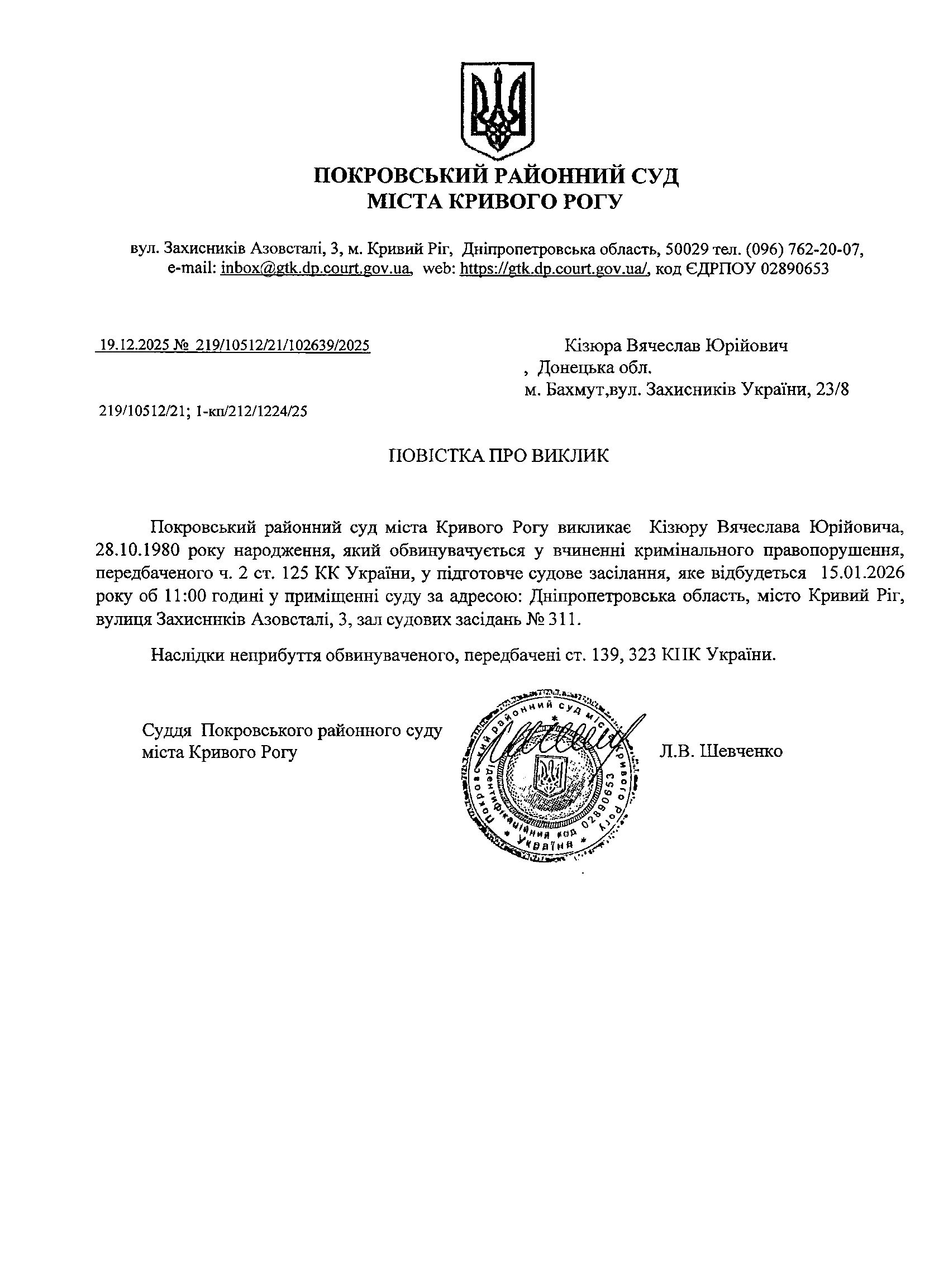 Оголошення про виклик до суду Кізюри Вячеслава Юрійовича