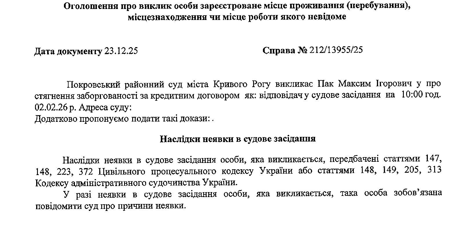 Оголошення про виклик до суду Пака Максима Ігоровича