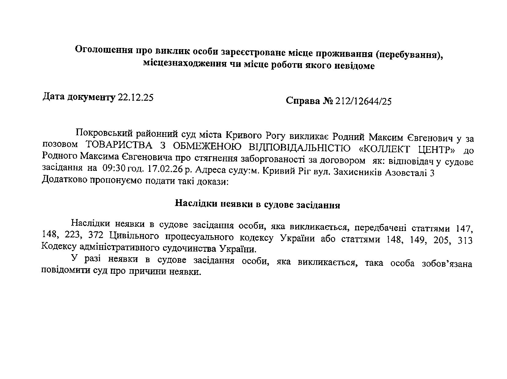 Оголошення про виклик до суду Родного Максима Євгеновича