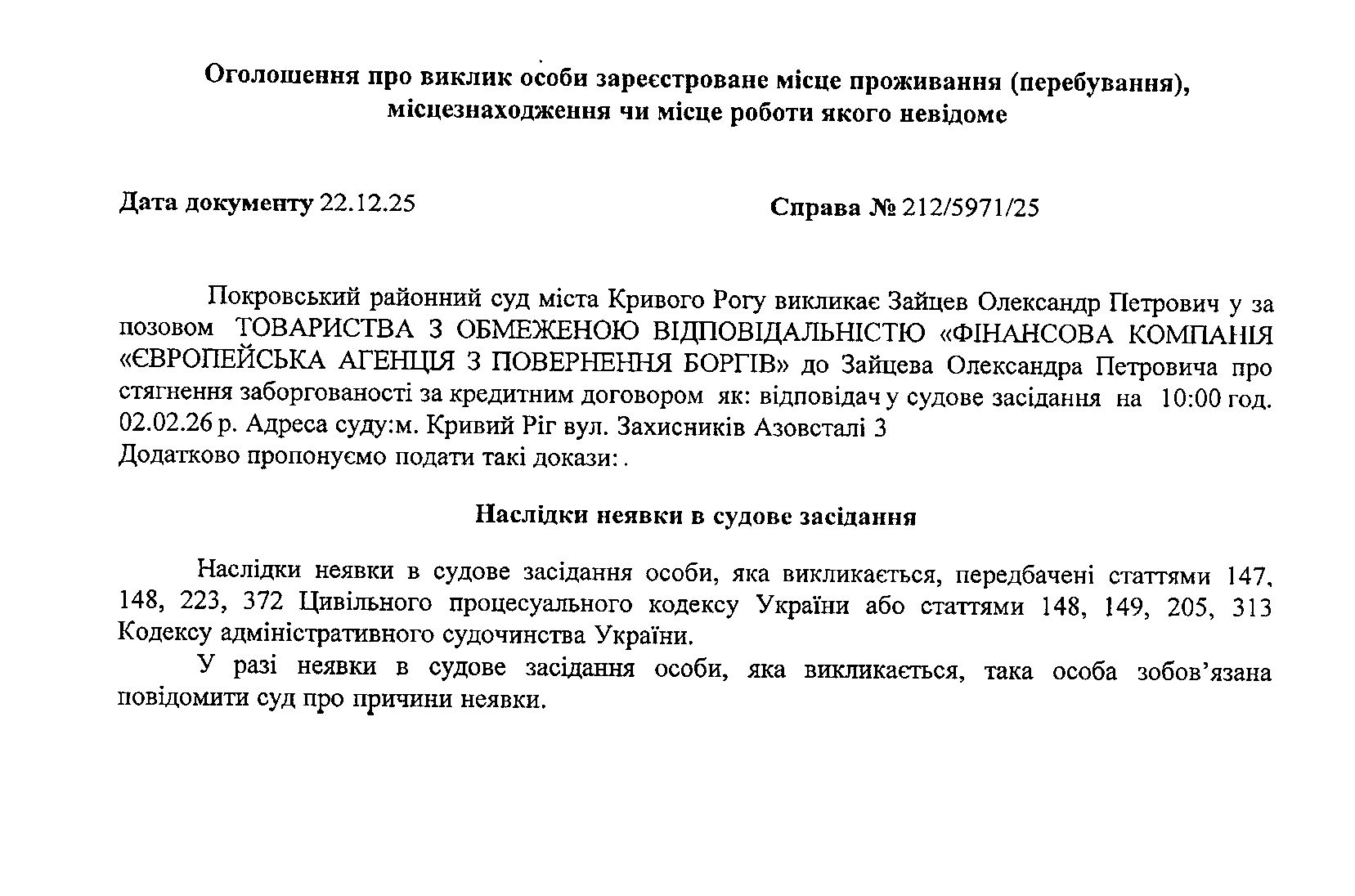 Оголошення про виклик до суду Зайцева Олександра Петровича