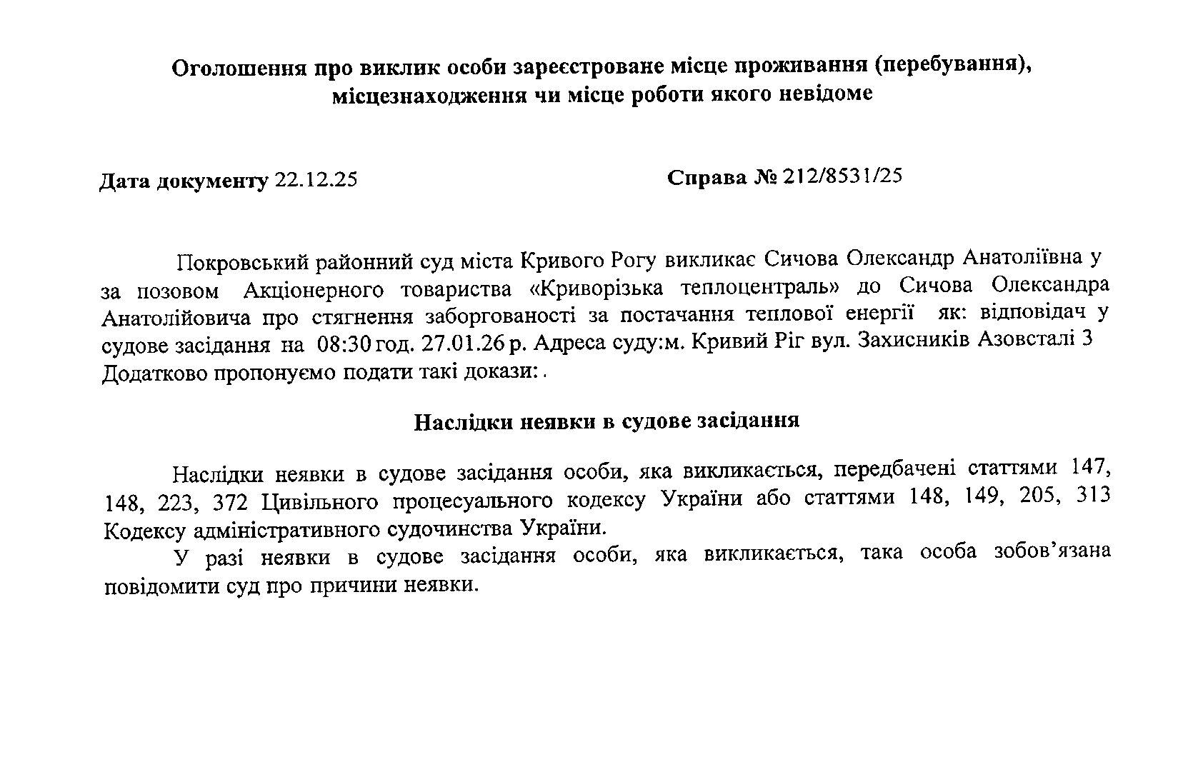 Оголошення про виклик до суду Сичової Олександри Анатоліївни