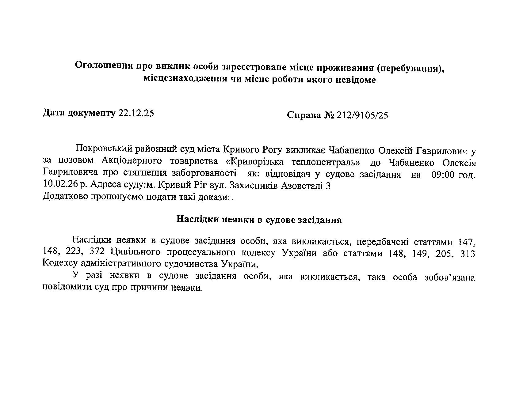 Оголошення про виклик до суду Чабаненка Олексія Гавриловича