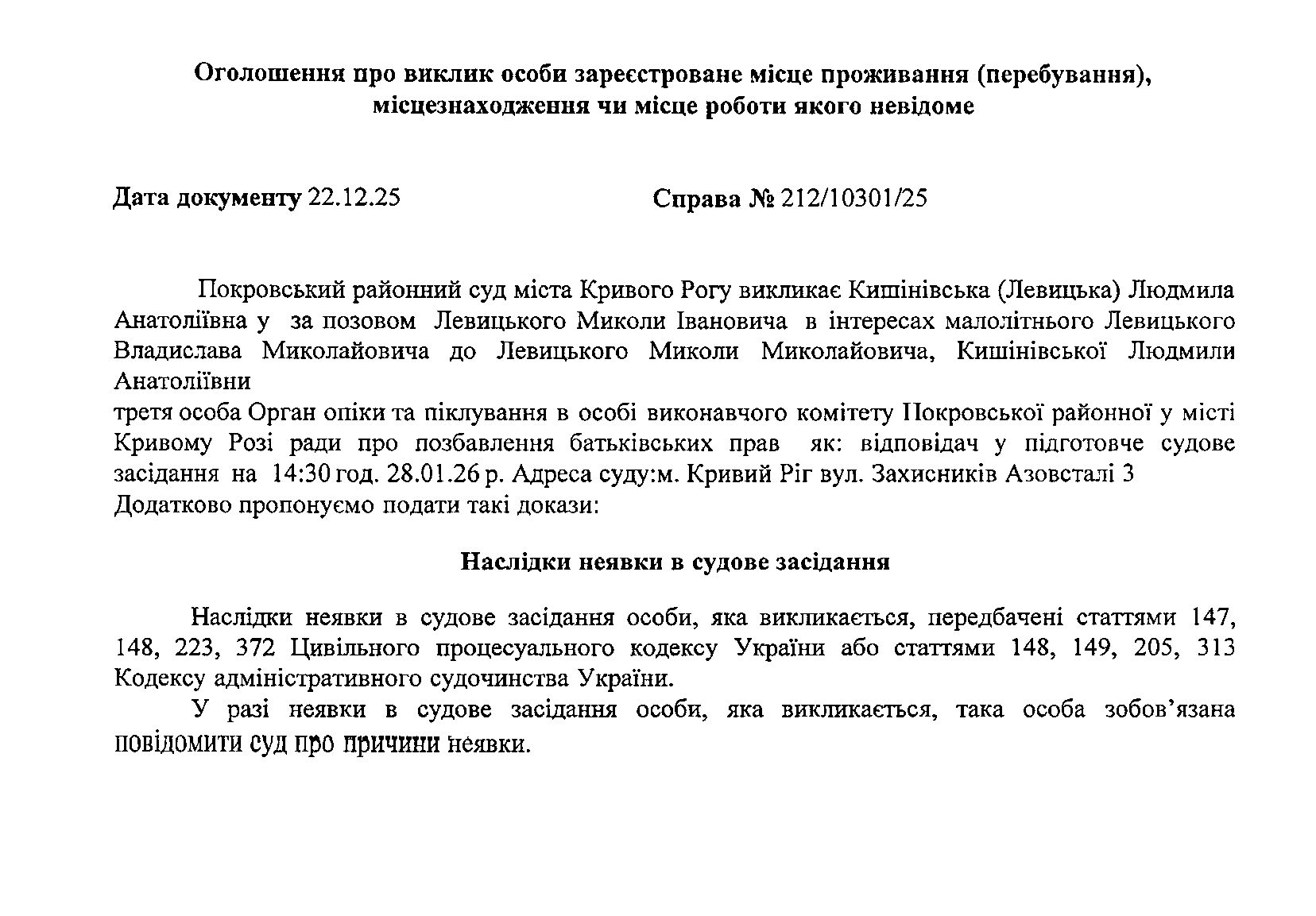 Оголошення про виклик до суду Кишінівської (Левицької) Людмили Анатоліївни