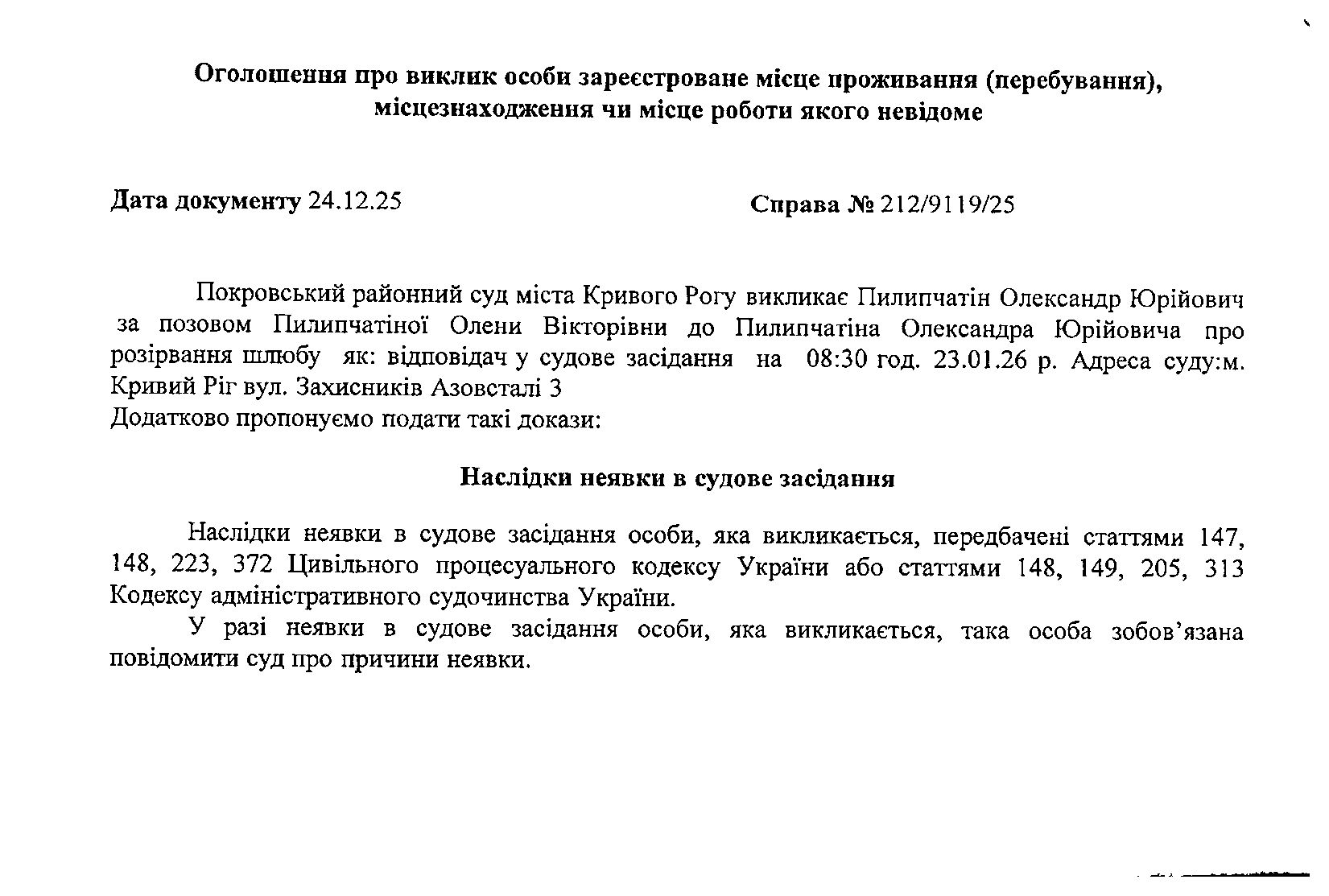 Оголошення про виклик до суду Пилипчатіна Олександра Юрійовича