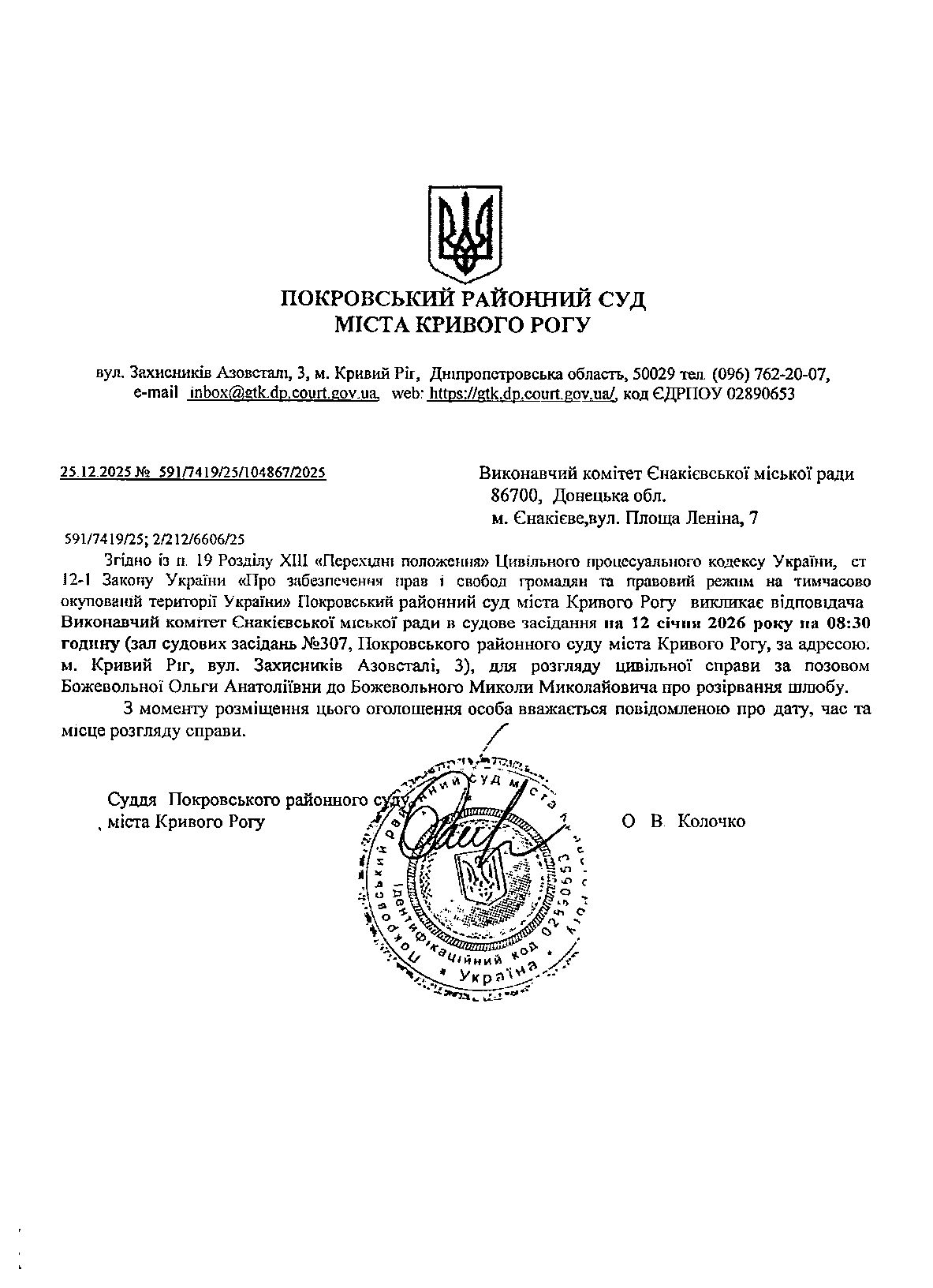 Оголошення про виклик до суду Єнакієвської міської ради