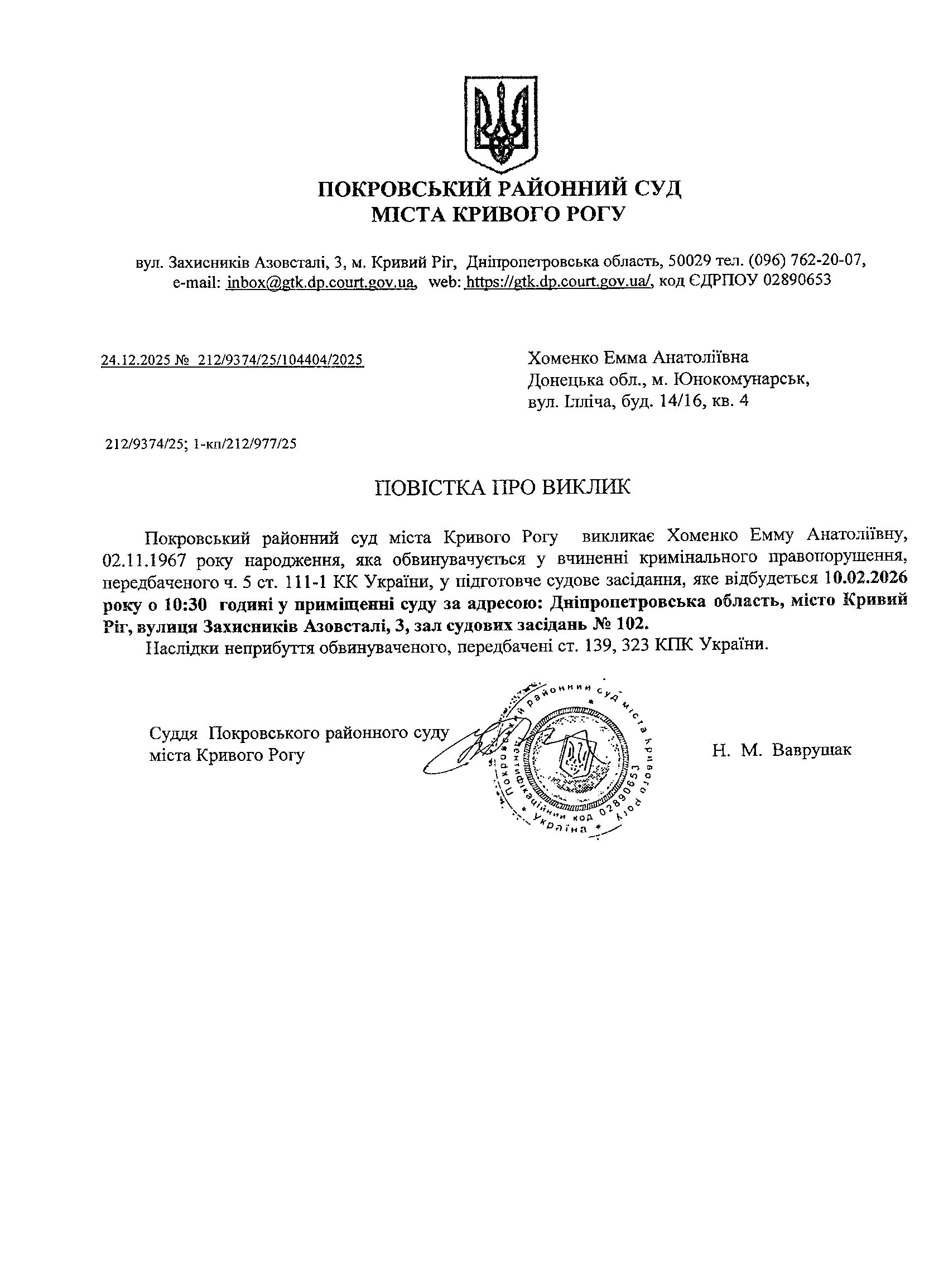 Оголошення про виклик до суду Хоменко Емми Анатоліївни