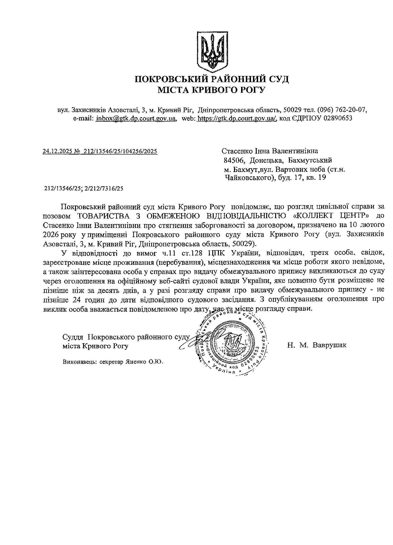 Оголошення про виклик до суду Стасенко Ірини Анатоліївни