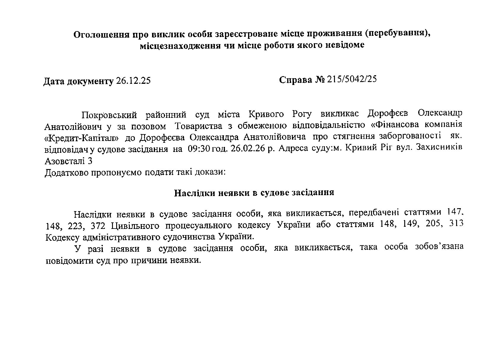 Оголошення про виклик до суду Дорофєєва Олександра Анатолійовича