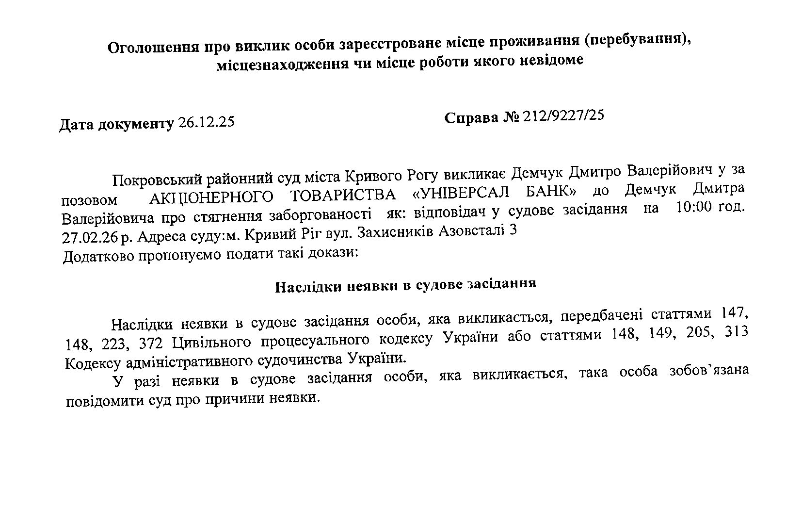 Оголошення про виклик до суду Демчука Дмитра Валерійовича