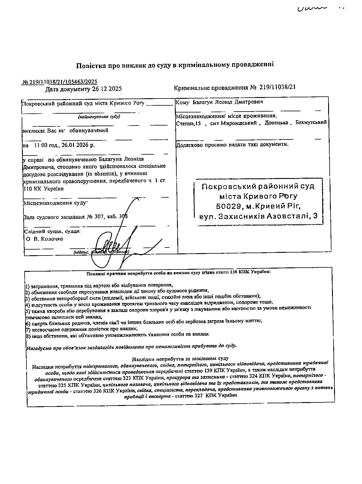 Оголошення про виклик до суду Балагуна Леоніда Дмитровича