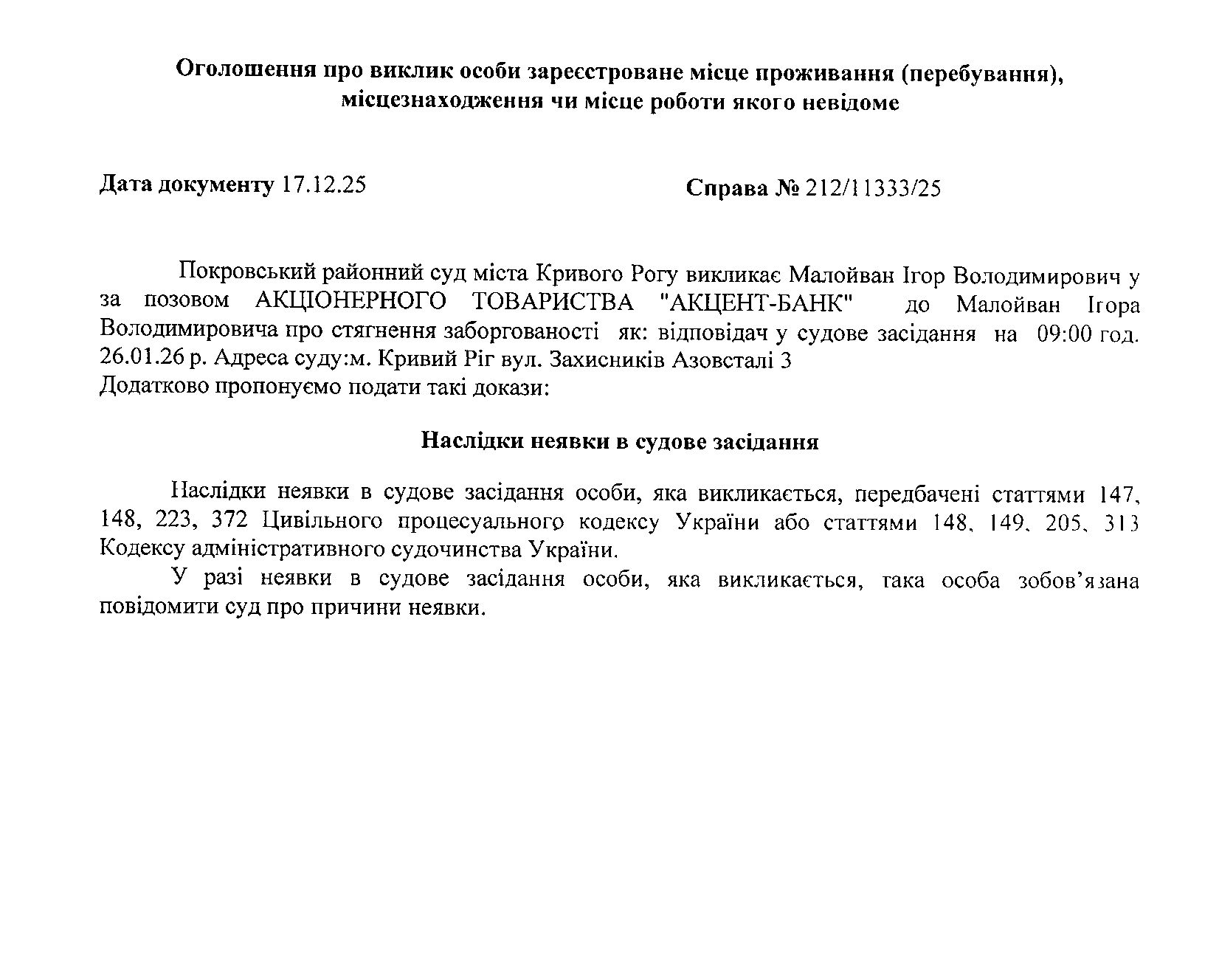 Оголошення про виклик до суду Малойвана ІгорВолодимировича