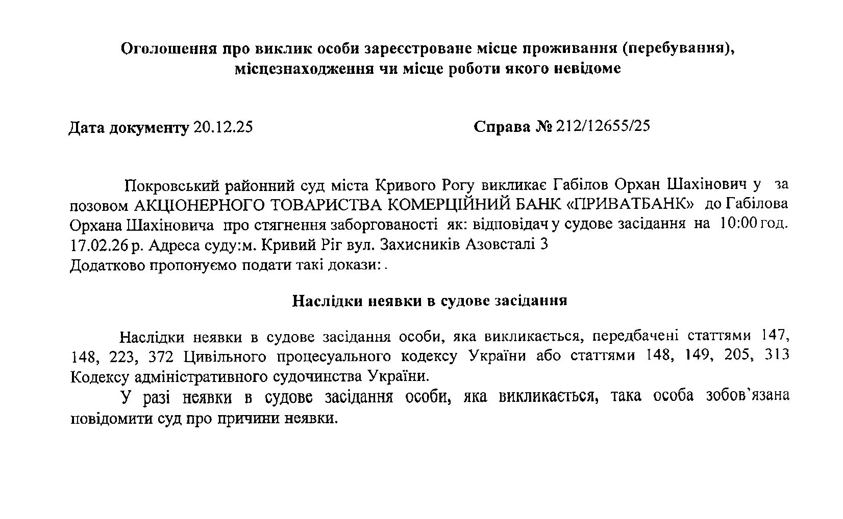 Оголошення про виклик до суду Габілова Орхана Шахіновича