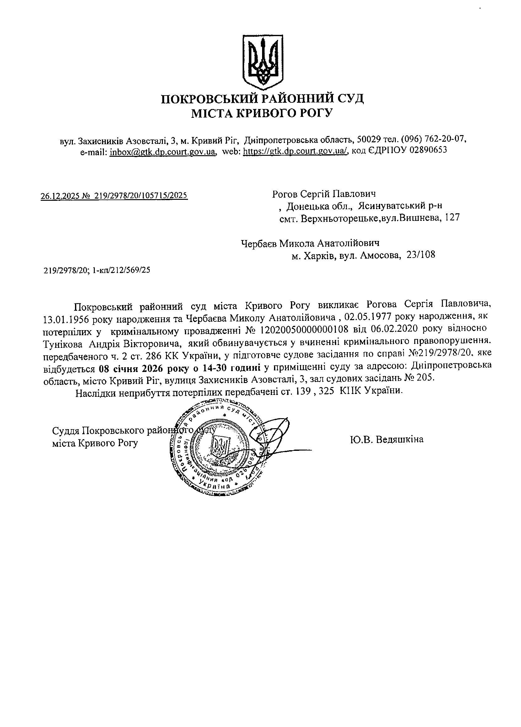 Оголошення про виклик до суду Рогова Сергія Павловича, Чербаєва Миколи Анатолійовича
