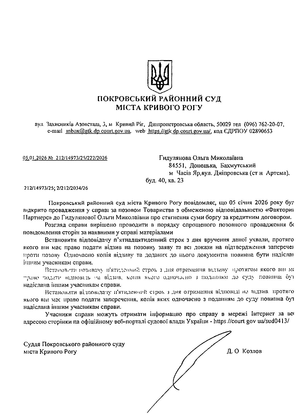 Оголошення про виклик до суду Гидулянової Ольги Миколаївни