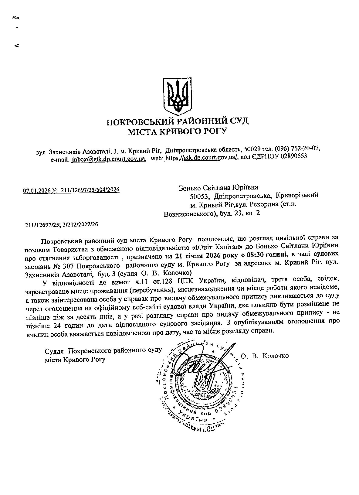 Оголошення про виклик до суду Бонько Світлани Юріївни