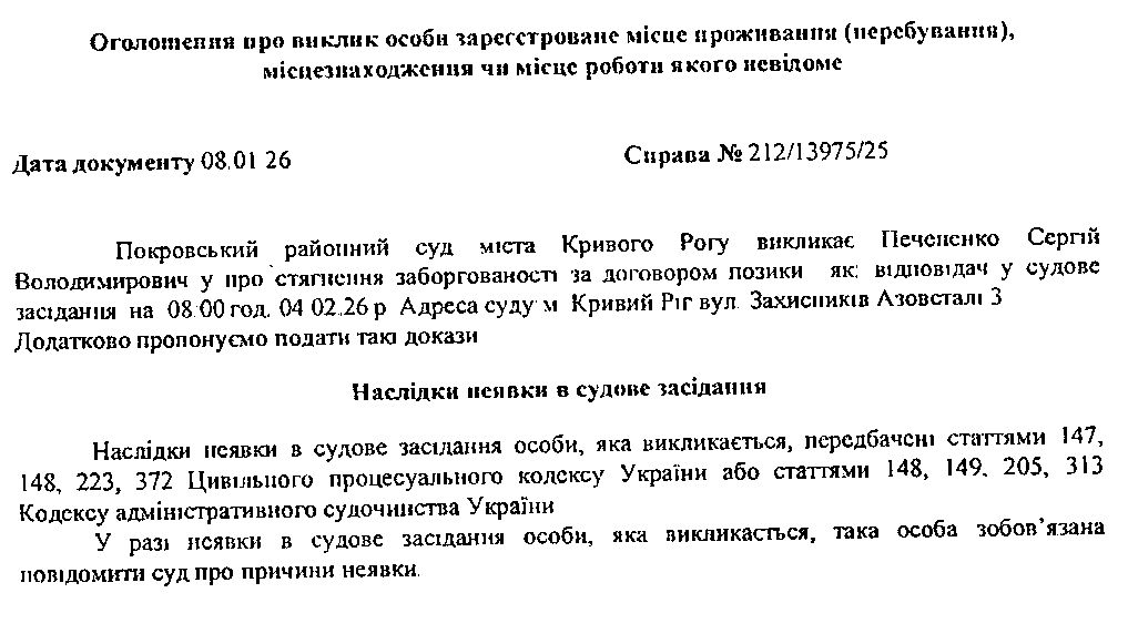Оголошення про виклик до суду Печененка Сергія Володимировича