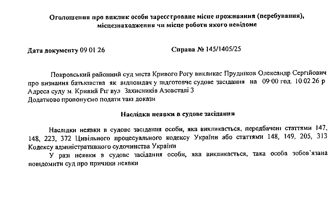 Оголошення про виклик до суду Пруднікова Олександра Сергійовича