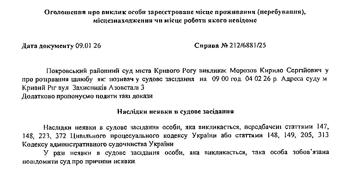Оголошення про виклик до суду Морозова Кирила Сергійовича