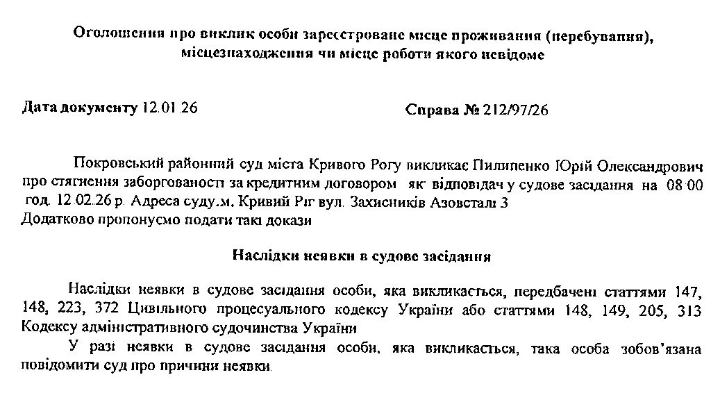 Оголошення про виклик до суду Пилипенка Юрія олександровича