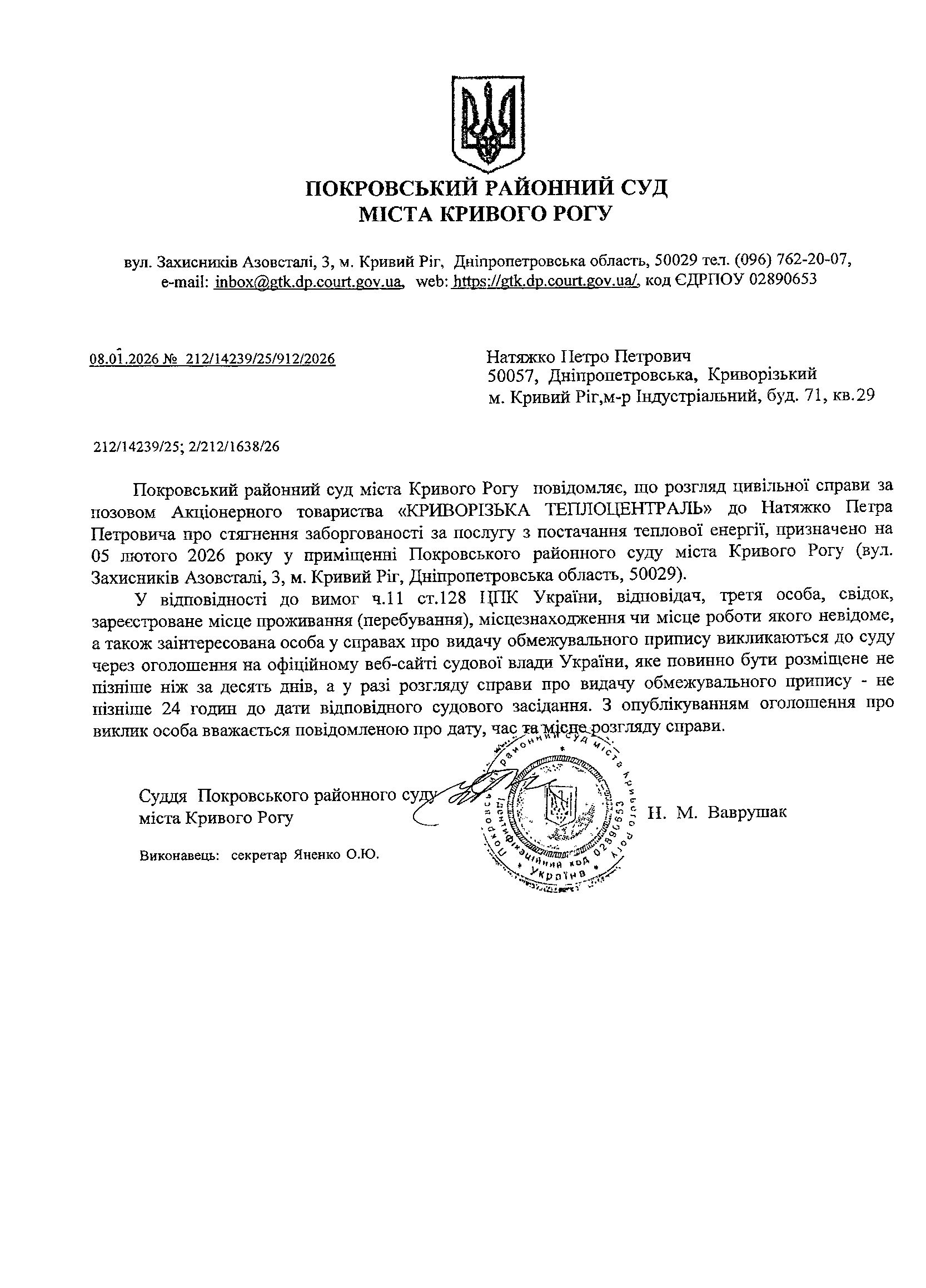 Оголошення про виклик до суду Натяжка Петра Петровича