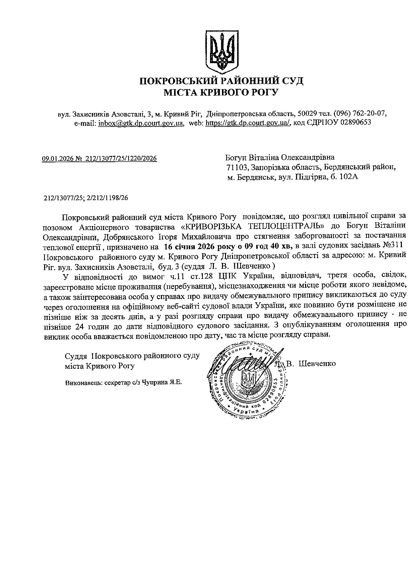 Оголошення про виклик до суду Богун Віталіни Олександрівни
