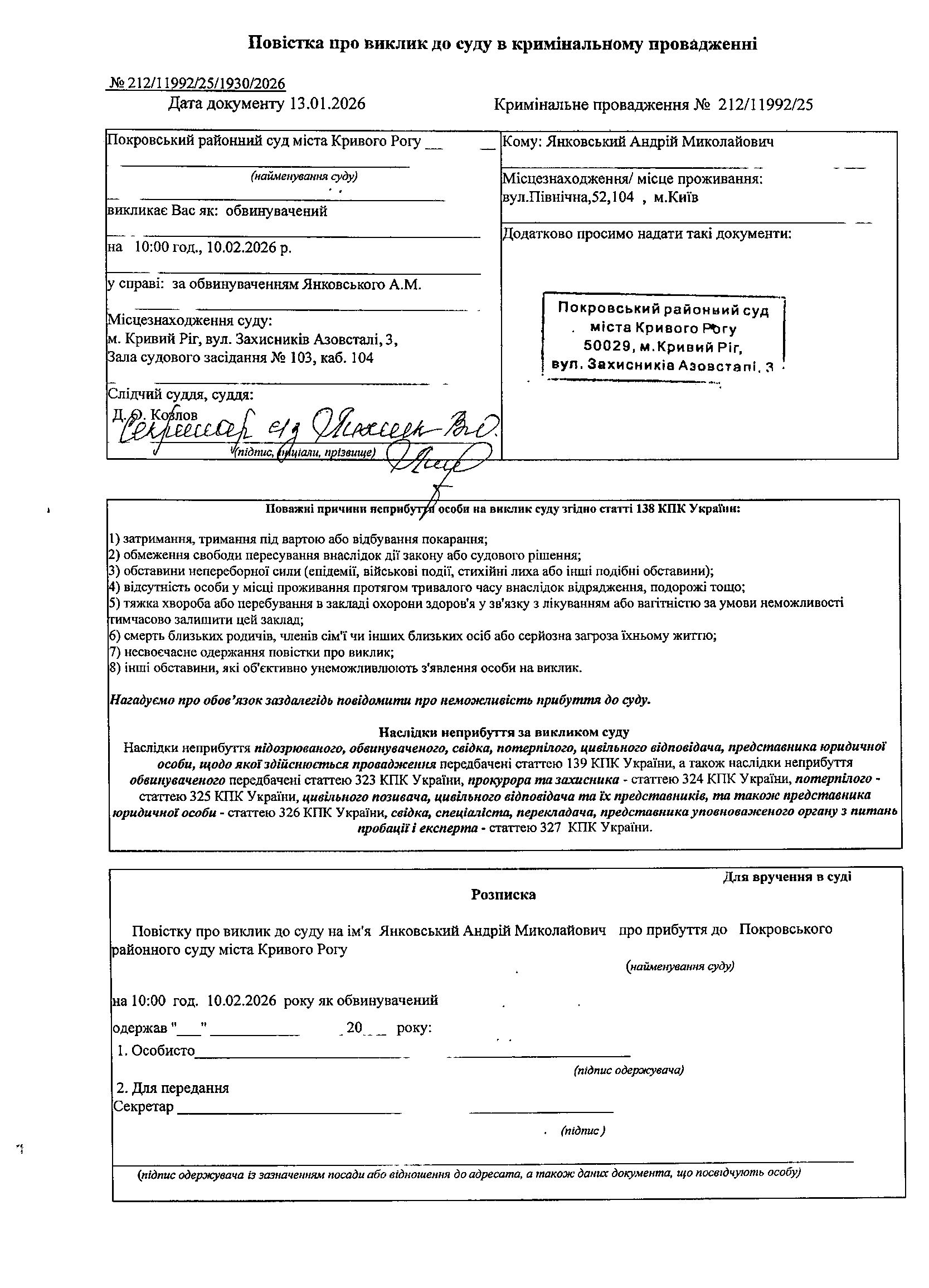 Оголошення про виклик до суду Янковськовського Андрія Миколайовича