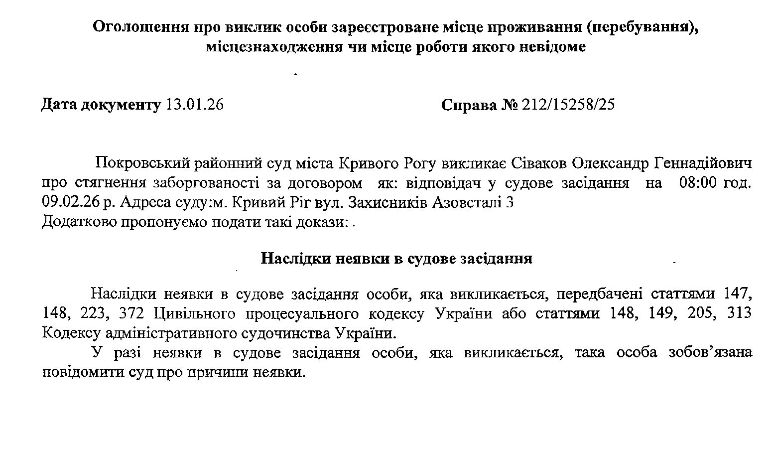 Оголошення про виклик до суду Сівакова Олександра Геннадійовича