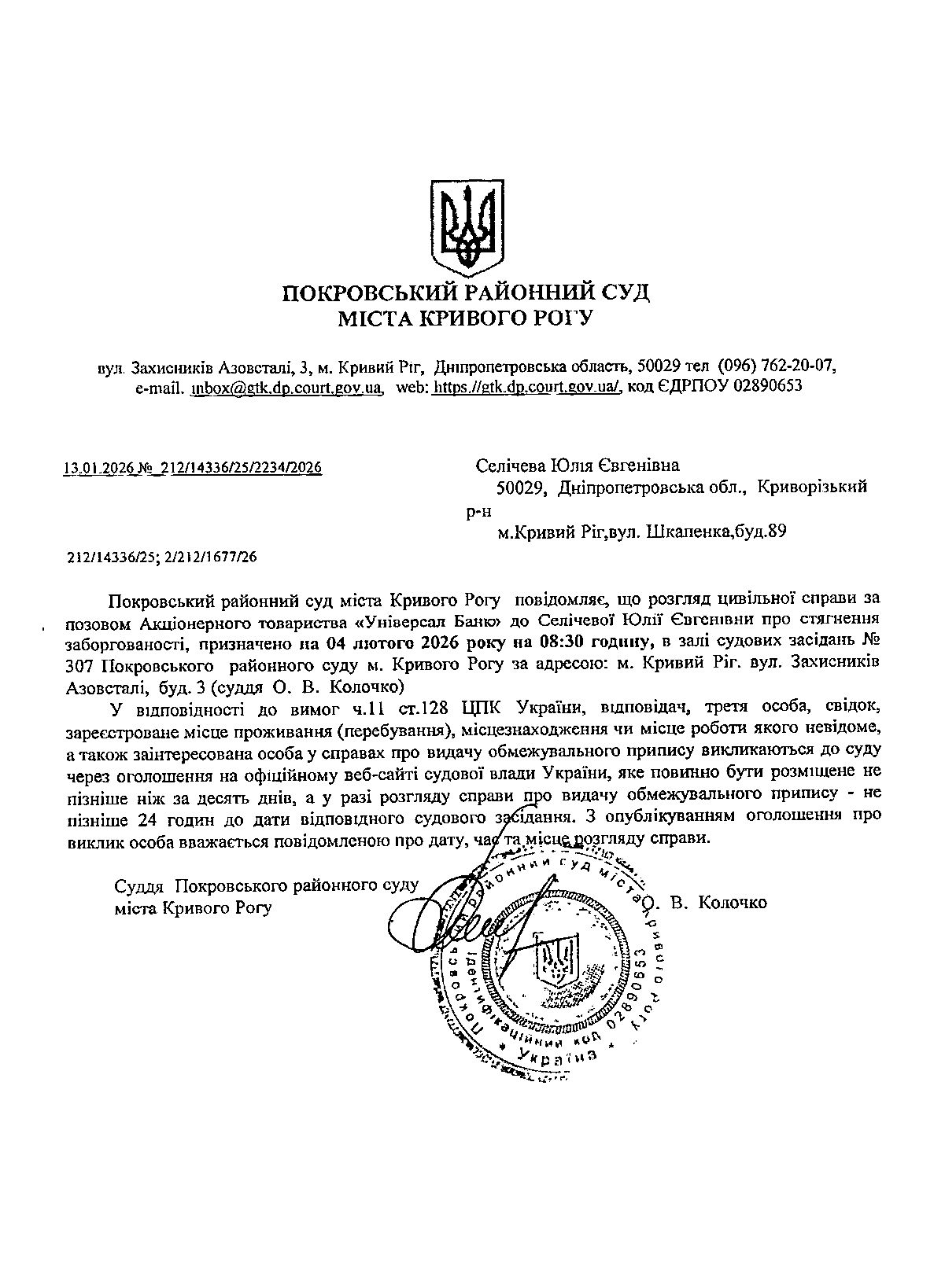 Оголошення про виклик до суду Селічевої Юлії Євгенівни