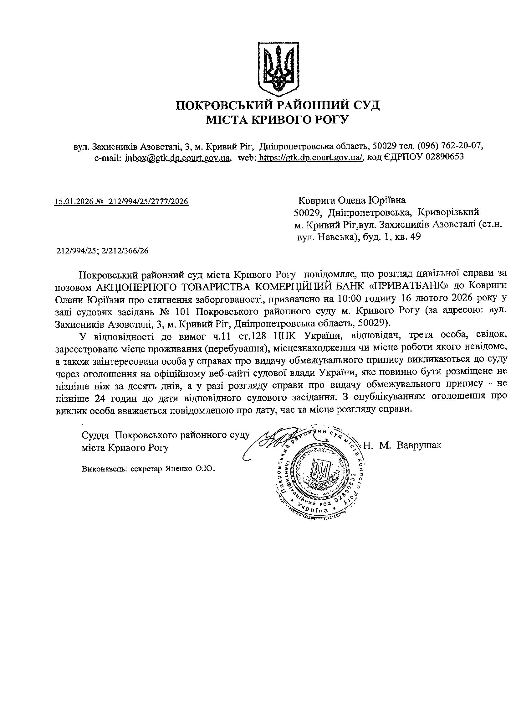 Оголошення про виклик до суду Ковриги Олени Юріївни
