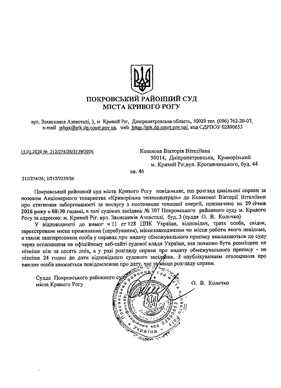 Оголошення про виклик до суду Козакової Вікторії Віталіївни