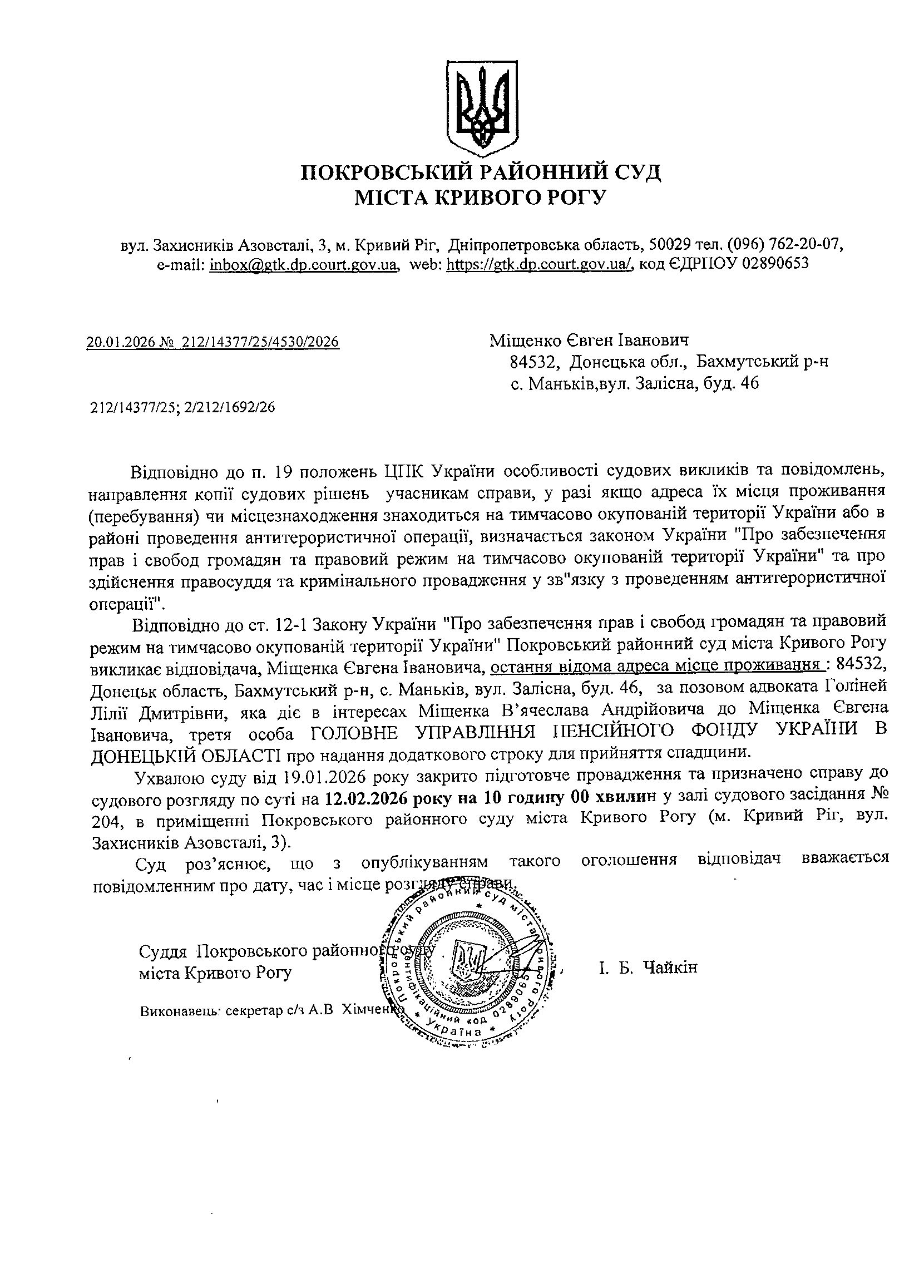 Оголошення про виклик до суду Міщенка Євгена Івановича