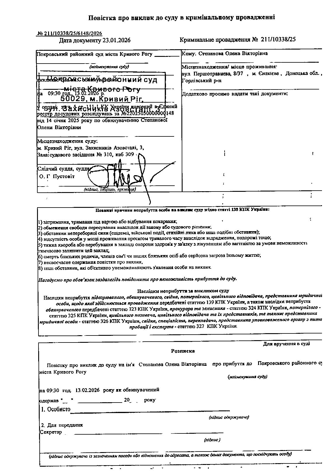 Оголошення про виклик до суду Степанової Олени Вікторівни
