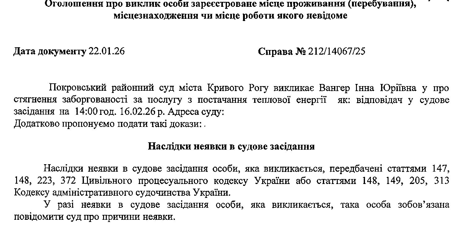 Оголошення про виклик до суду Ванген Інни Юріївни