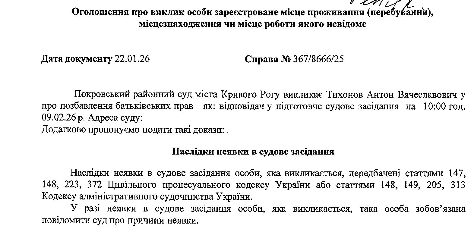 Оголошення про виклик до суду Тихонова Антона Вячеславовича