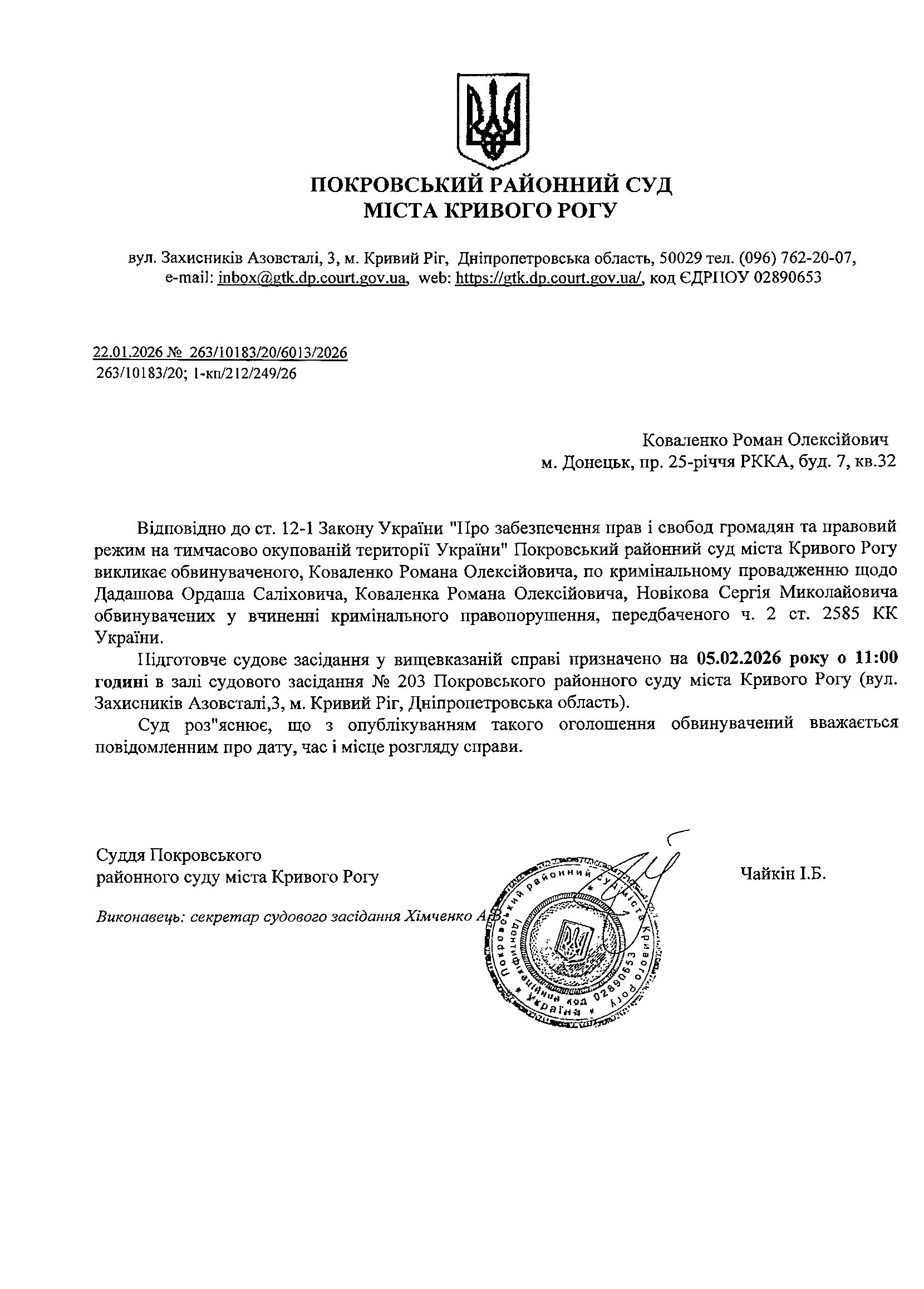 Оголошення про виклик до суду Коваленка Романа Олексійовича