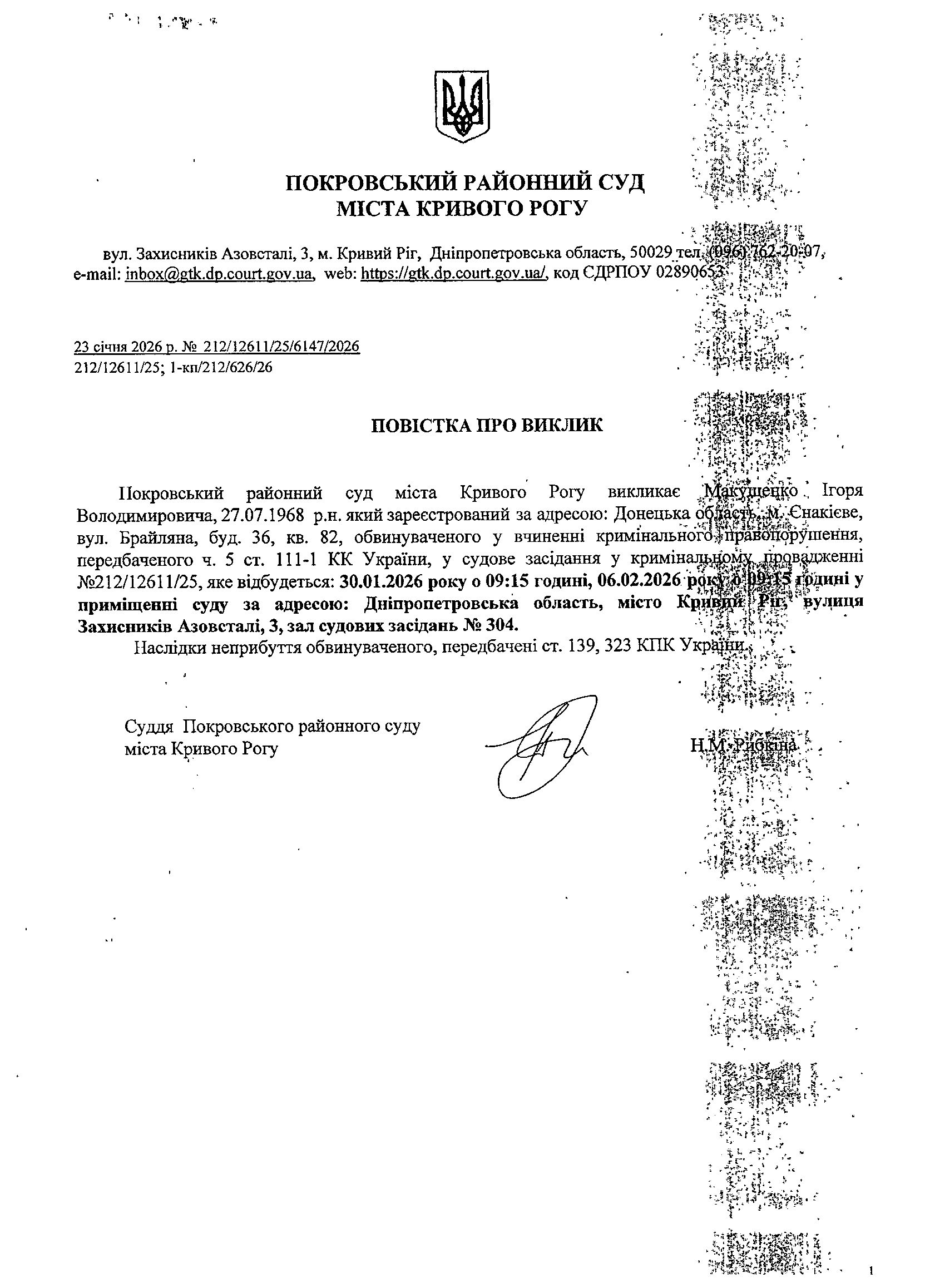 Оголошення про виклик до суду Макущенка Ігоря Володимировича