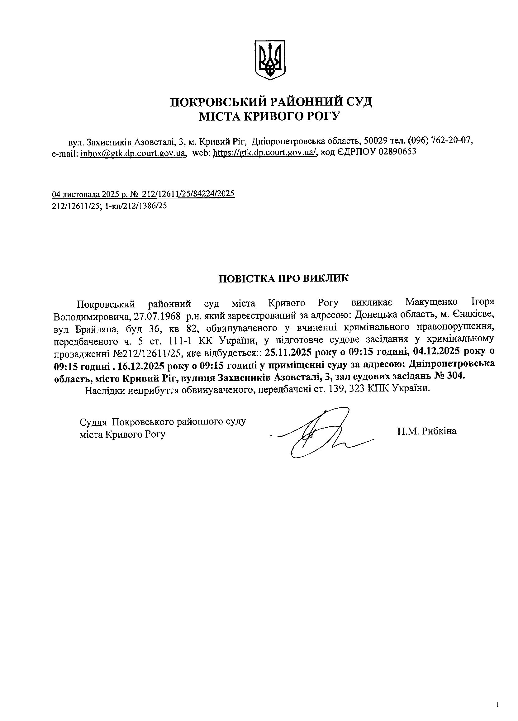 Оголошення про виклик до суду Макущенка Ігоря Володимировича
