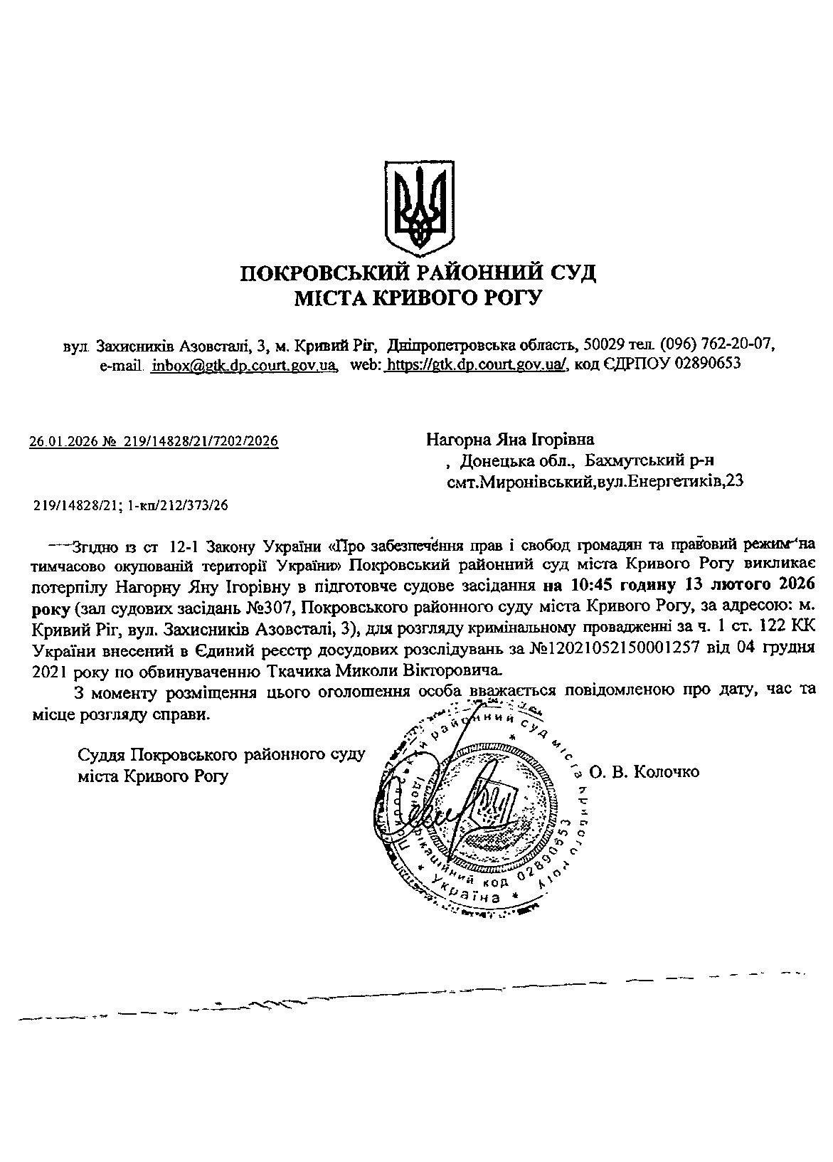 Оголошення про виклик до суду Нагорної Яни Ігорівни