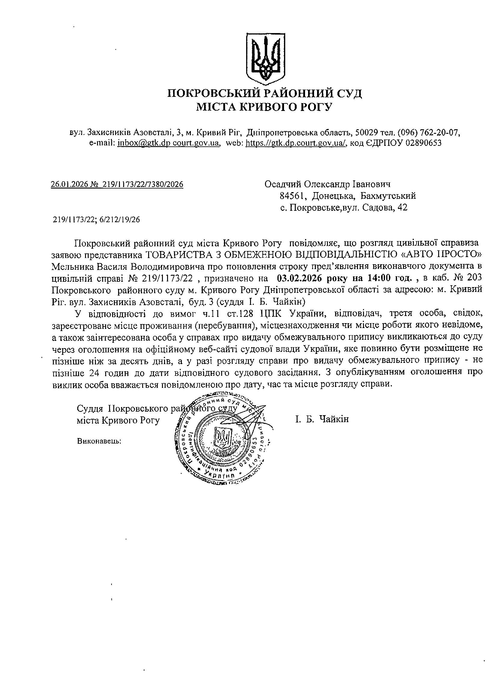 Оголошення про виклик до суду Осадчого Олександра Івановича