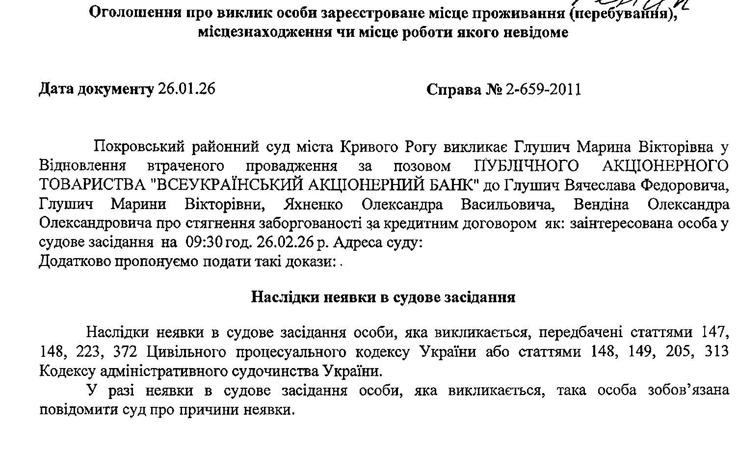 Оголошення про виклик до суду Глушич Марини Вікторівни