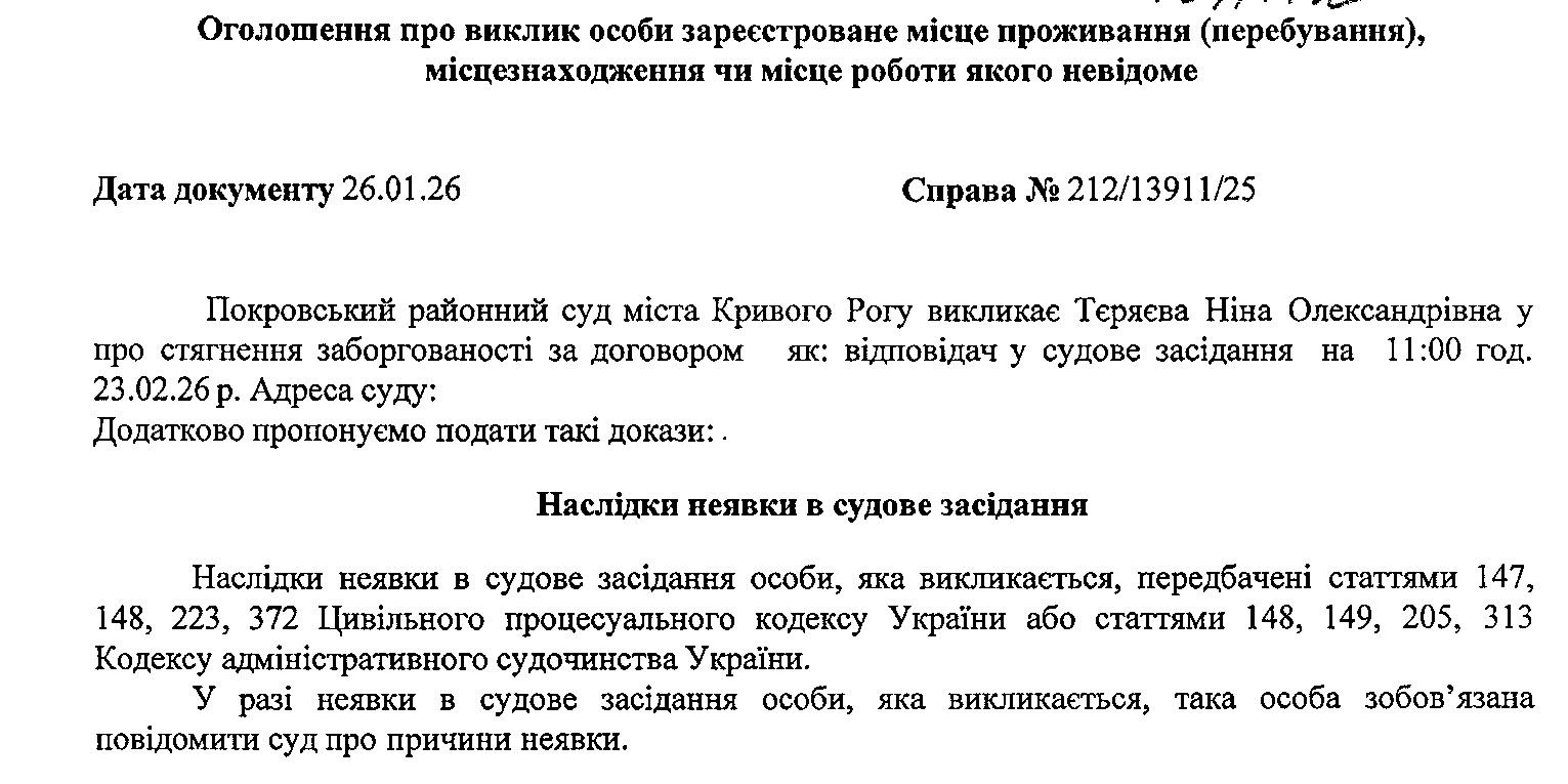 Оголошення про виклик до суду Тєряєвої Ніни Олександрівни