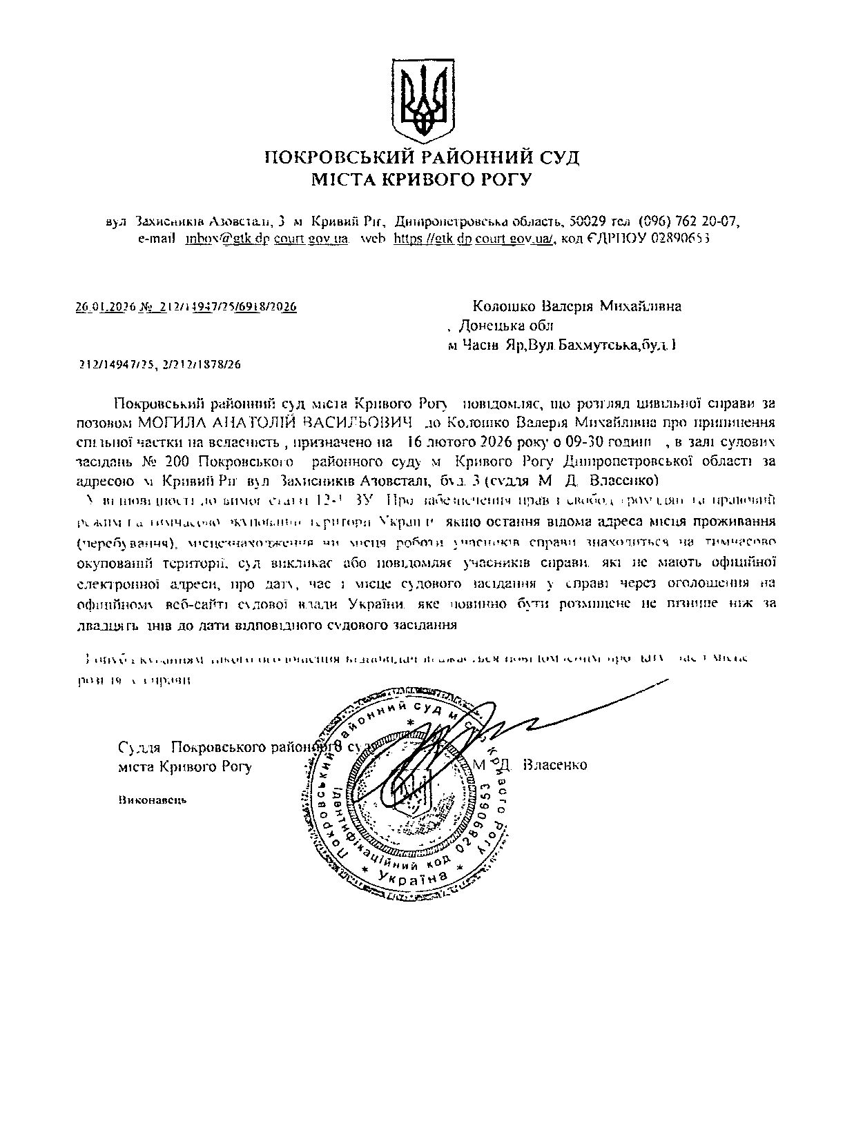 Оголошення про виклик до суду Колошка Валерії Михайлівни