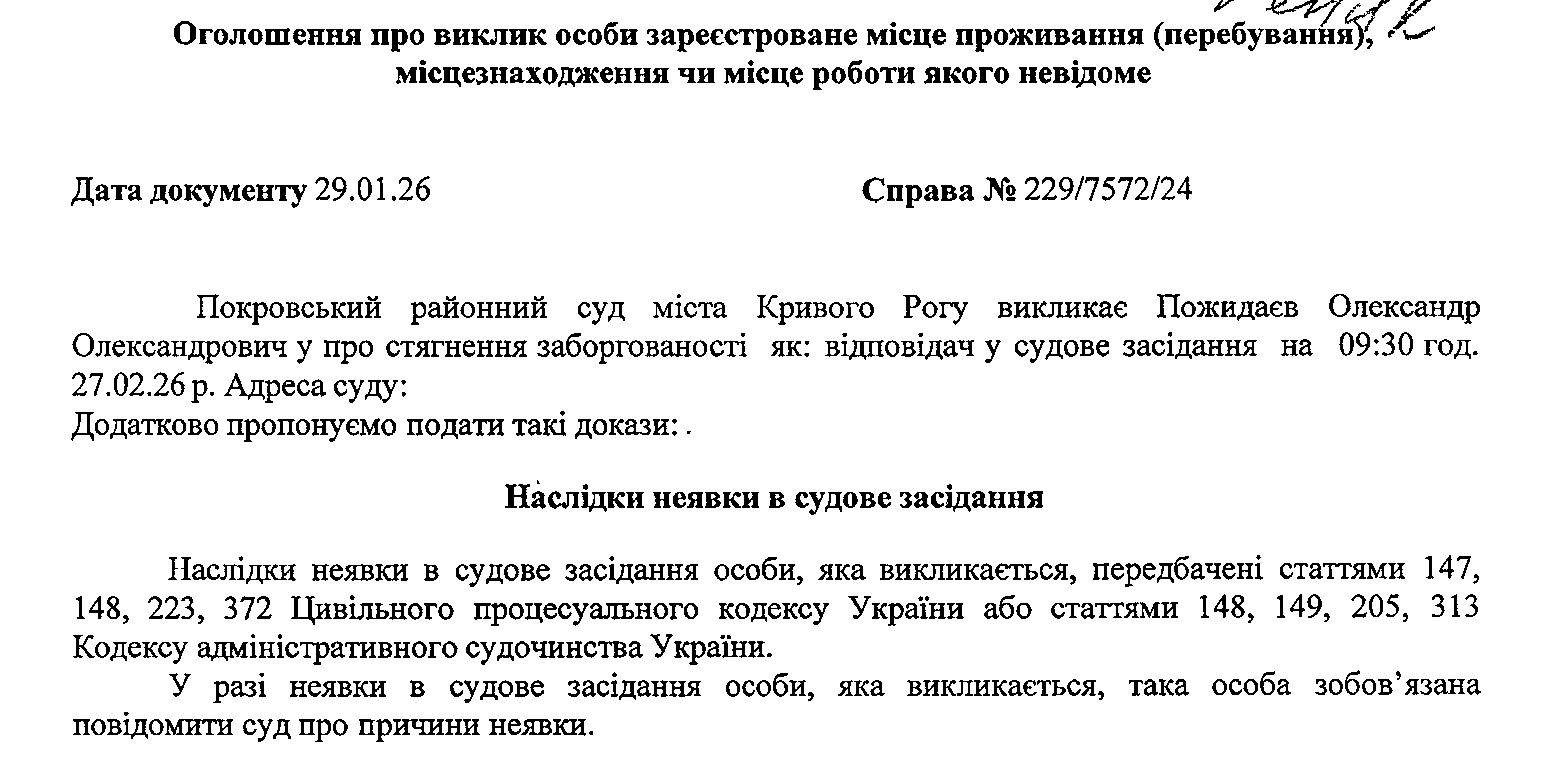 Оголошення про виклик до суду Пожидаєва Олександра Олександровича