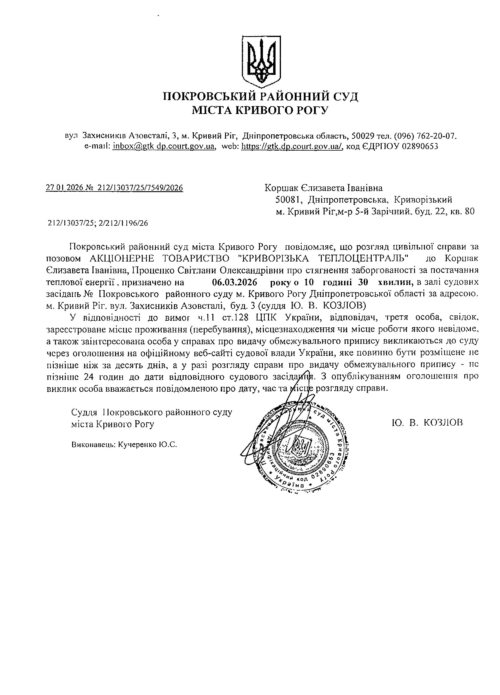 Оголошення про виклик до суду Коршак Єлизавети Іванівни