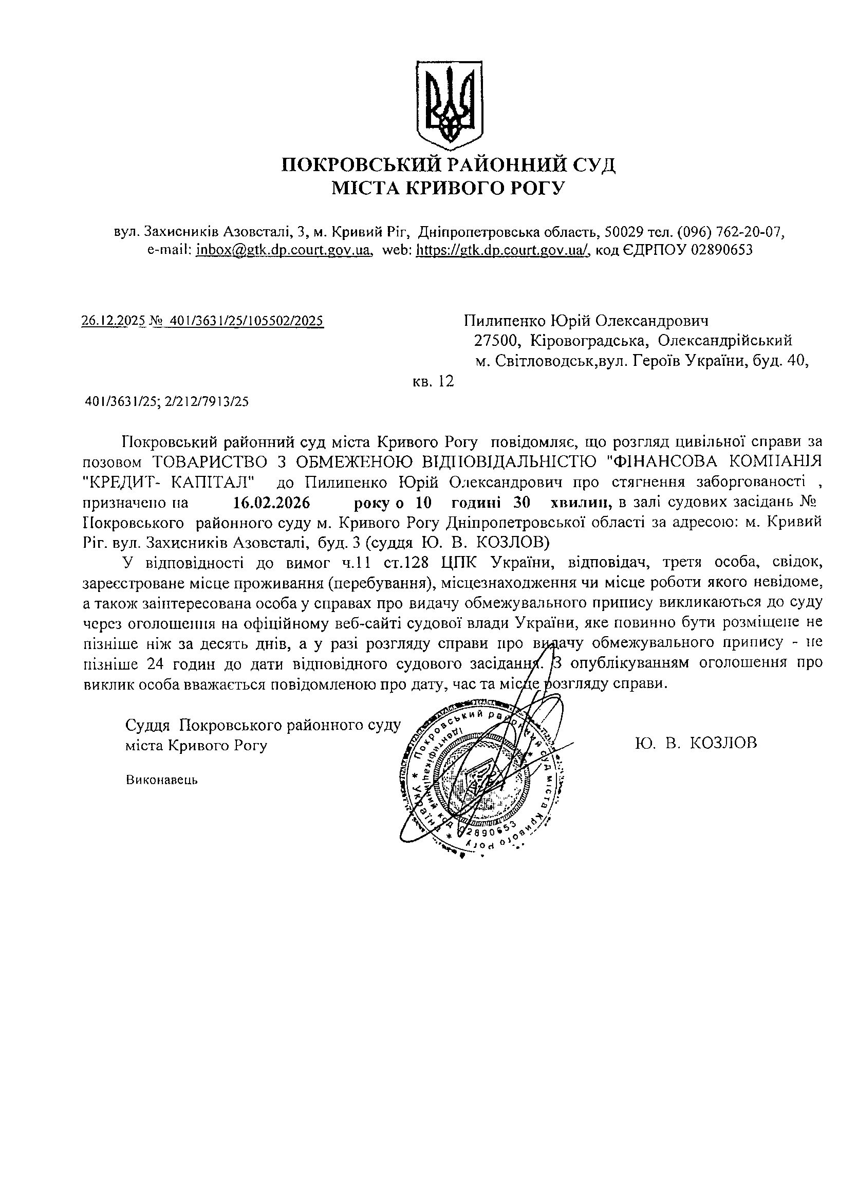 Оголошення про виклик до суду Пилипенка Юрія Олександровича